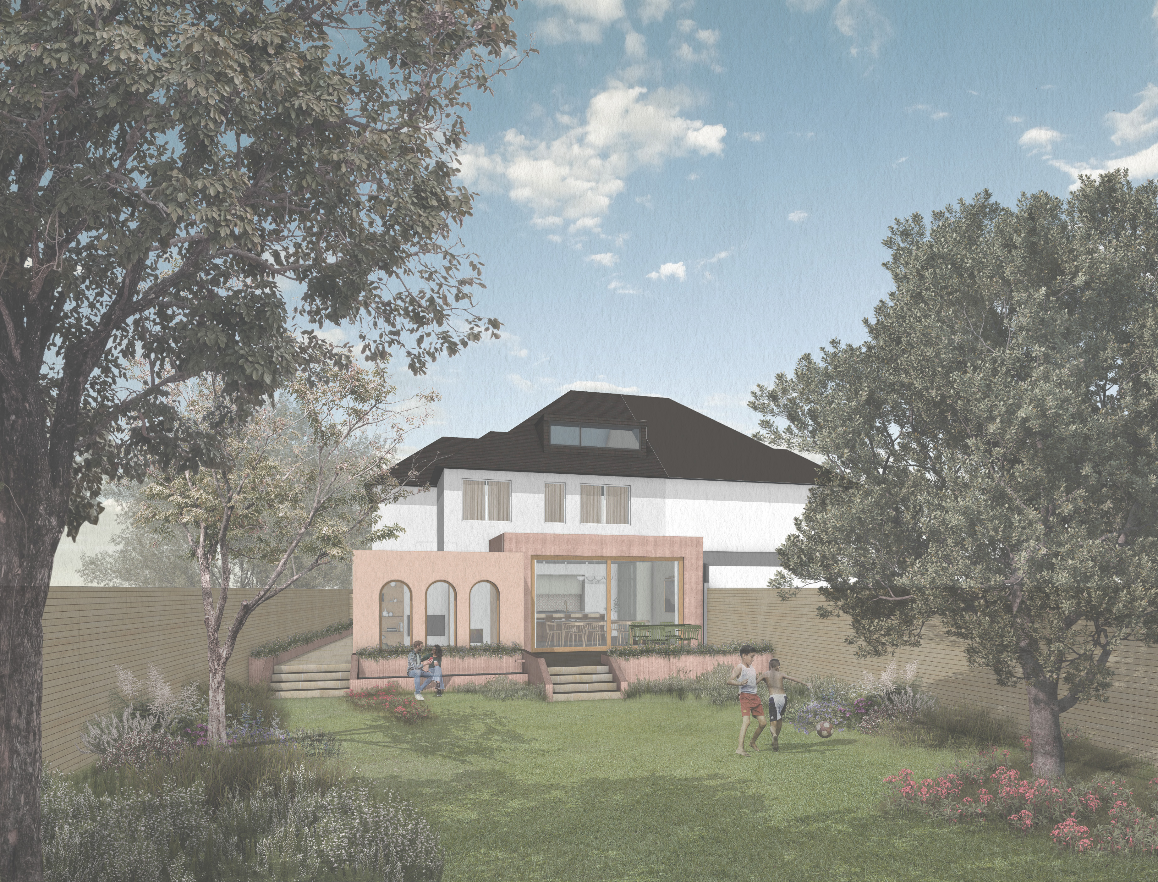 The glazing is expressed as a kinked protrusion with painted frames and vertical T&G panneling and this will be painted bright red, which alongside the weathered oak cladding will reflect the colours of the old apple tree in the garden. We hope it’s going to be a very special project!